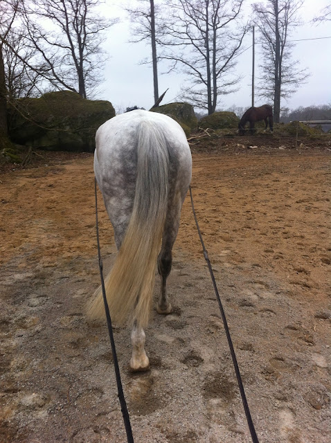 Började att jobba fjonte i padocken kändes inte så inspirerande då det var kyligt ute! Han va så seg först så lände att detta blir ju ett trevligt ridpass, not. Men denna grabben brukar vanligtvis bli finare desto längre man rider så i detta fallet också :) när han väl fick sin fina ridbarhet är han en fröjd. Hoppade ett sockerbitshinder på volt helt plötsligt i landningen skjuter han in bakdelen under sig och stannar och ser avslappnad ut. Kollar och på sidan hänger ländtäcket hmm för sex månader sedan hade han kastat av mig då lugnare har han blivit..:) skrittade fram ute i dag och få fick han syn på två tranor på åkern som inte brukar vara där men han var super cool ( bilden tagen bår han spanar in dom)